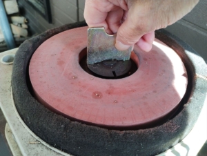 さっそく刃物研ぎ機付属の専用工具で今までついていた中砥石をはずし