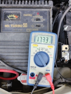 バッテリーを充電するのだからこれくらいは当然で、充電中はバッテリー両端の電圧は12V台です。しかし、、もしバッテリーを外すとその瞬間この約17Vの電圧が車にかかります。