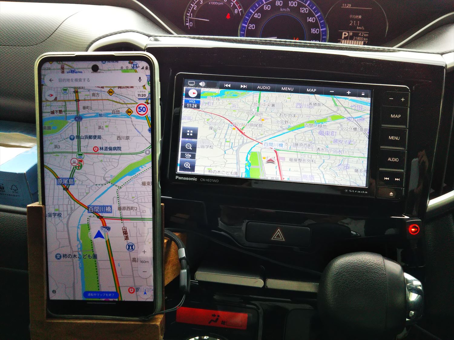 次の写真はCN-HE01WDのナビ画面とスマホ画面のYahoo!カーナビを並べて表示させたところです。