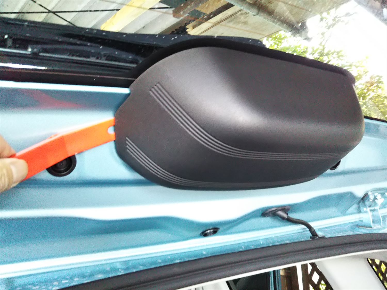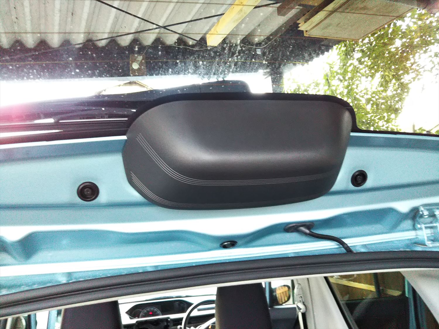 ワゴンRのワイパーモーターはリアガラスの上部、この中にあります。