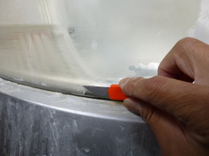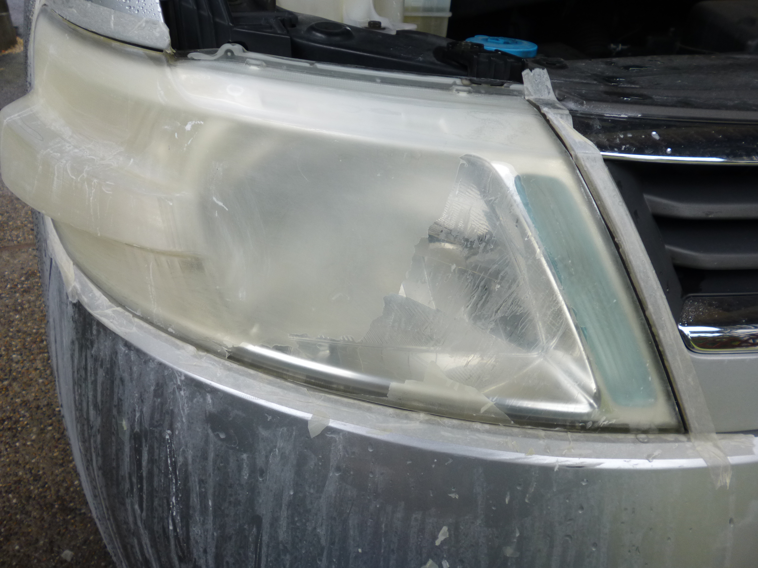 ヘッドライトの黄ばみは表面だけですので、黄ばみがなくなるまで耐水ペーパーで削っていきます。