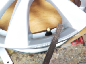 こういう補修はタイヤを組み付ける前でないとタイヤがじゃまになってうまくできない。