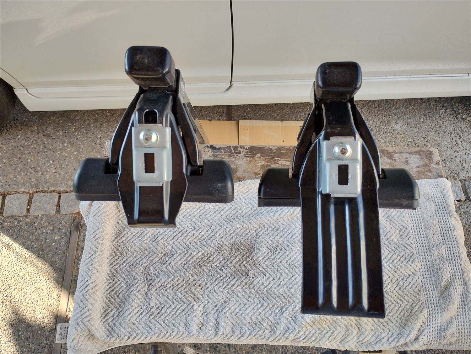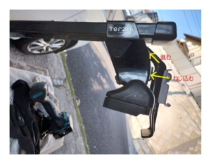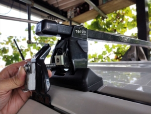 TERZOのフットをinnoのホルダーを使って固定し、ソリオのルーフキャリアの前後間隔を広げた