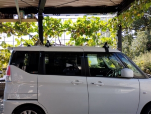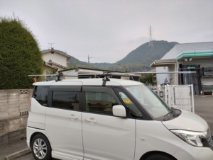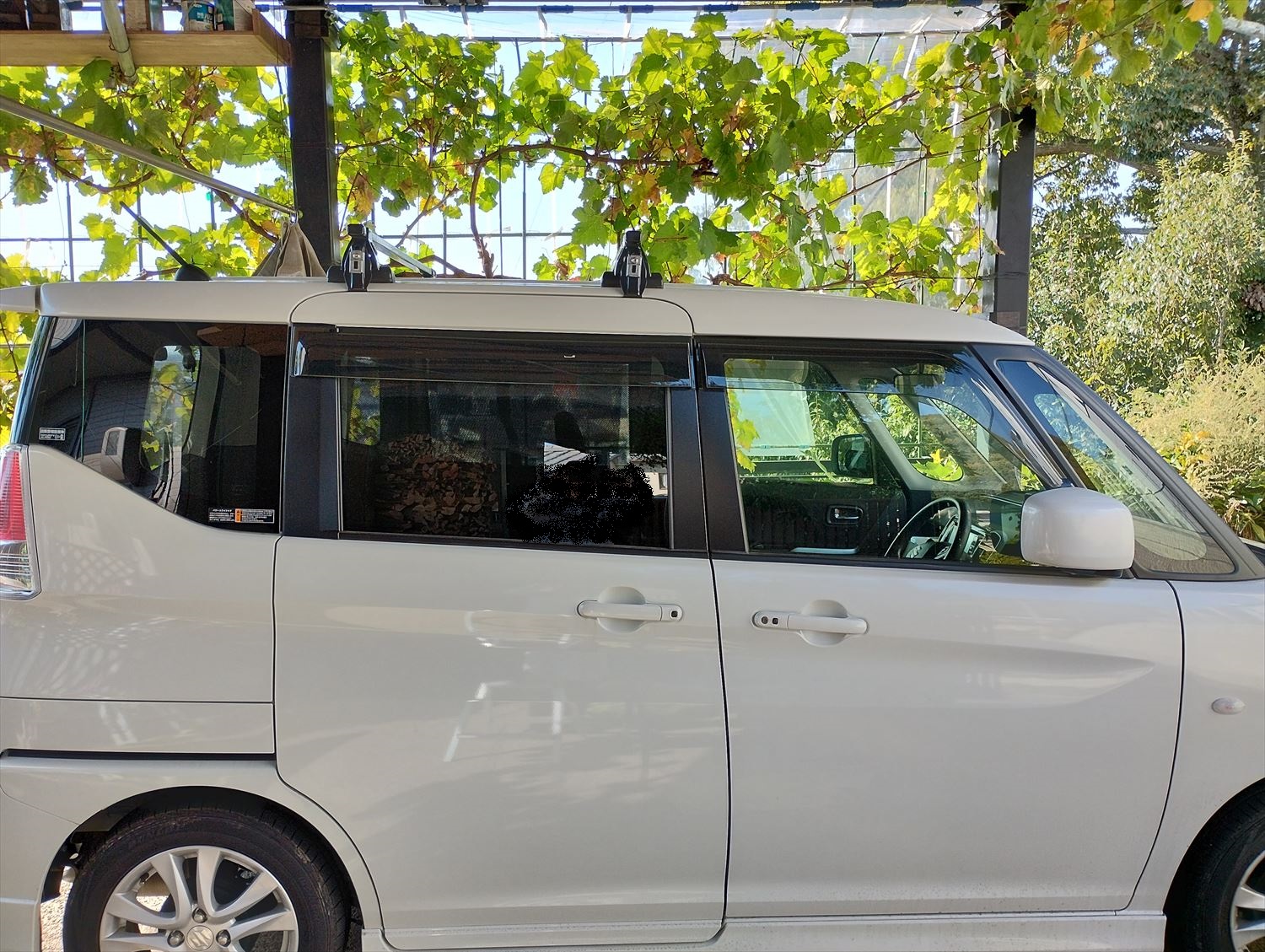 理由は日光を遮る部分の面積が小さいからなのですが、ルーフキャリアのバーの前後間隔が狭くて、大きな遮光物を乗せるのが怖いのです。