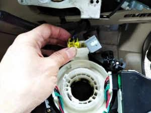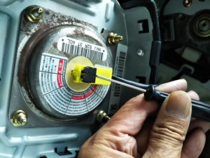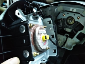 するとエアバッグのユニットが外れ、裏にエアバッグの黄色いコネクタがあるので