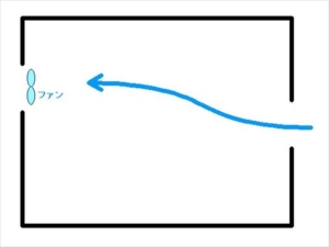 まず下の図の場合、風が左から右に吹いているときは、ファンは右方向に風を送ってやると能率よく換気できる。