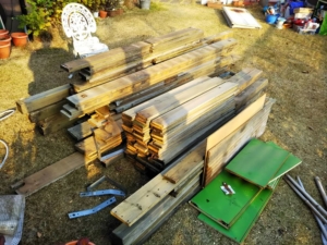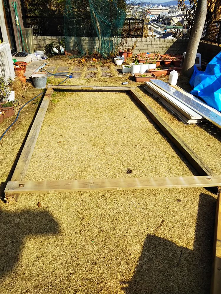 まず解体した板材を使って正確に製作予定のウッドデッキの大きさの枠をつくり、