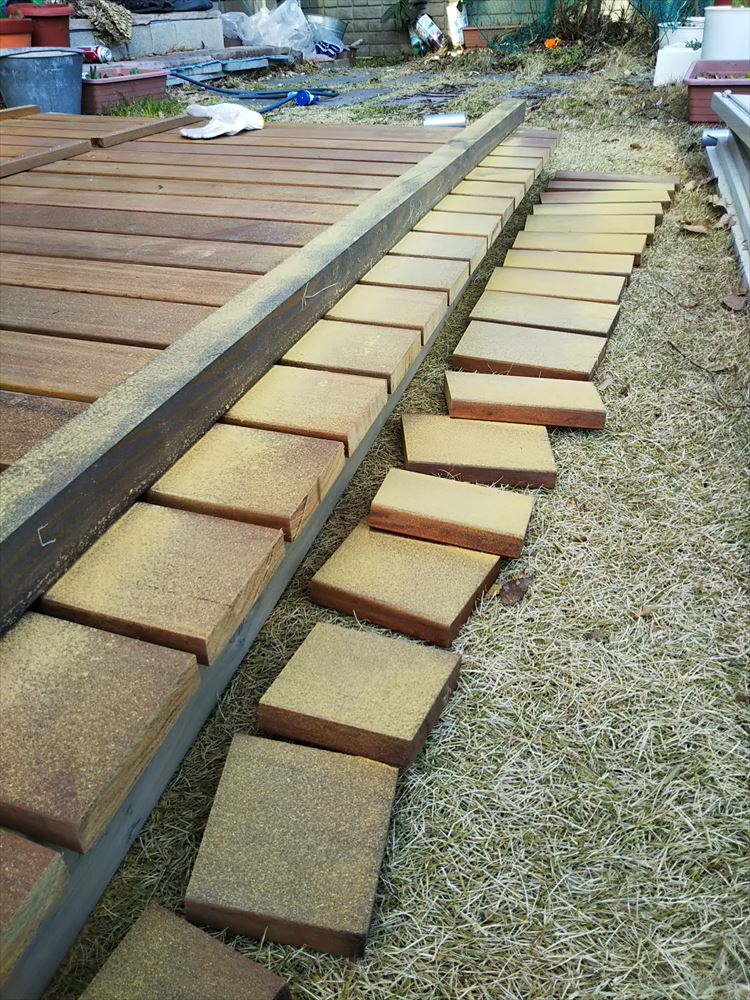 ウッドデッキは2階で作業すると危険な上ホコリが隣家へ飛んでいくので、庭で作り後で上にあげます。
