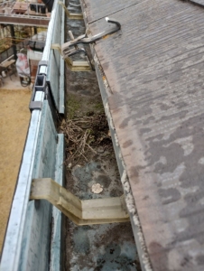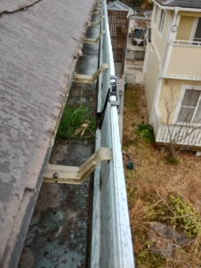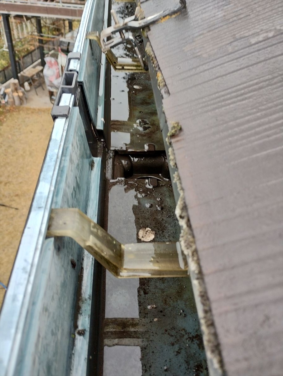 実はこの時高圧洗浄機を使おうとしたのですが、真っ直ぐなノズルだと手が届かないので樋の穴の中に直接噴射できないのと、高圧ホースに水漏れが発生したので断念したのでした。