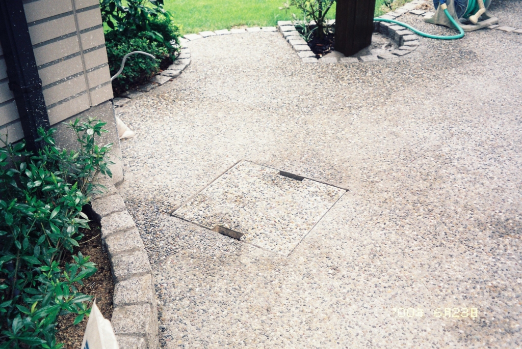 表面が洗い出され、玉砂利が程よく顔を出したところで完了。