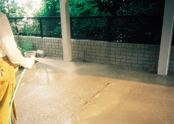 塗った後数時間経って、表面が固まりかけてきた頃、水で表面のモルタルを洗い流します。