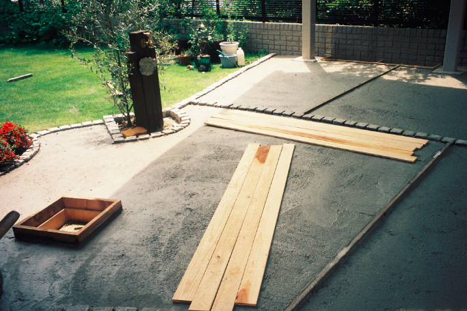 次の写真のコンクリートの上に敷いている板は、乾いていないコンクリートの上を歩くためのものです。