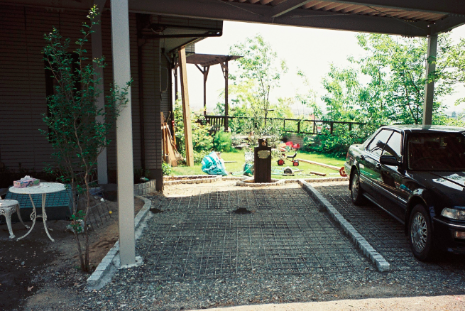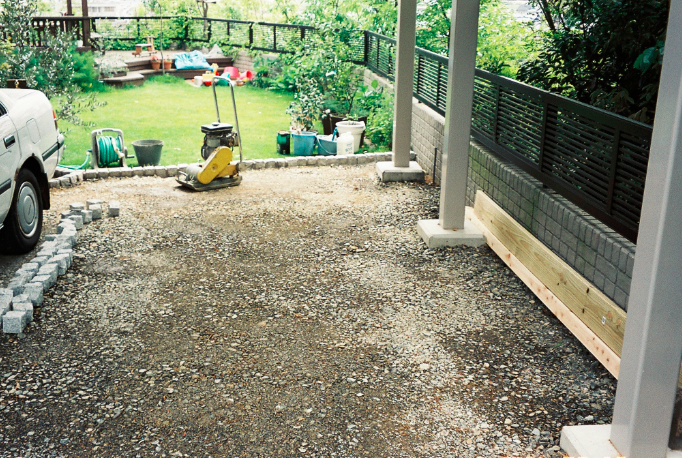 砂利を敷つめ、転圧プレート(レンタル)でよく押し固めます。