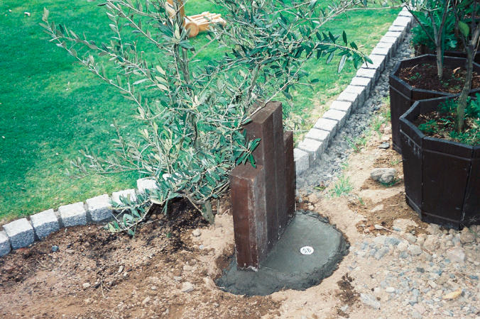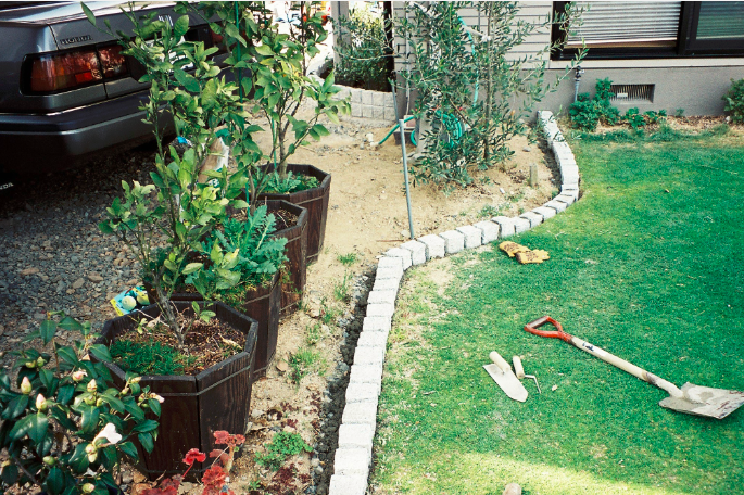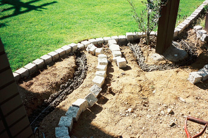 コンクリートを注文する前に、型枠を作っておかなければなりませんが、外構にピンコロ石を使っているので、デザインの一体感を出すために、型枠代わりにピンコロ石を使用しました。
