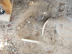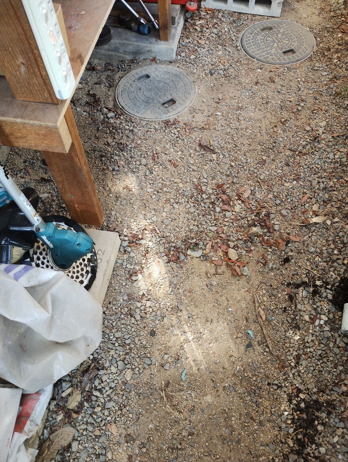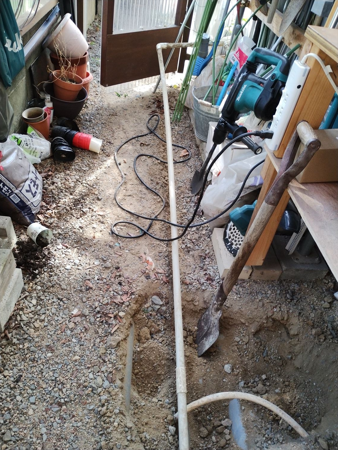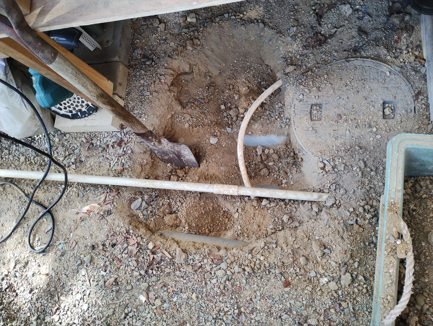 真っ直ぐな方は、以前使用していたエコキュートのドレン管であることは分かっていたので、切断して廃棄することにしてさらに掘り進みます。