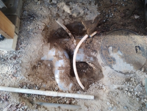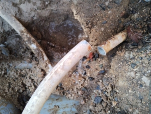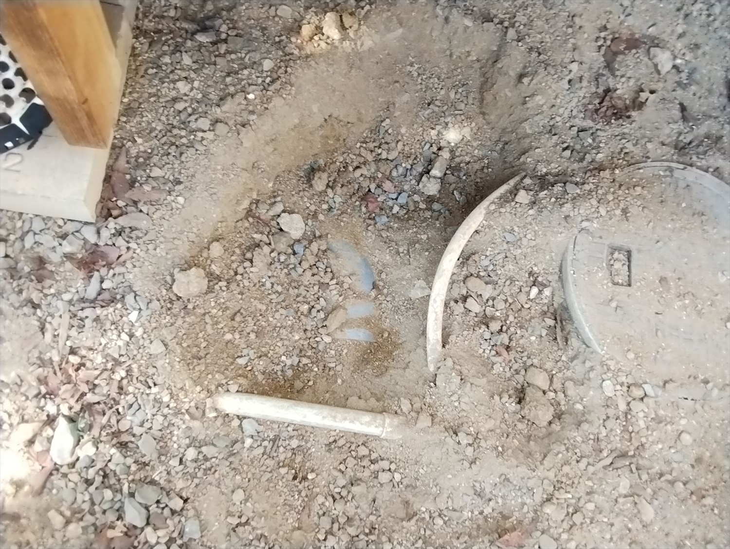 掘り進むうちに白い真っ直ぐな配管と曲線の配管が出てきました。