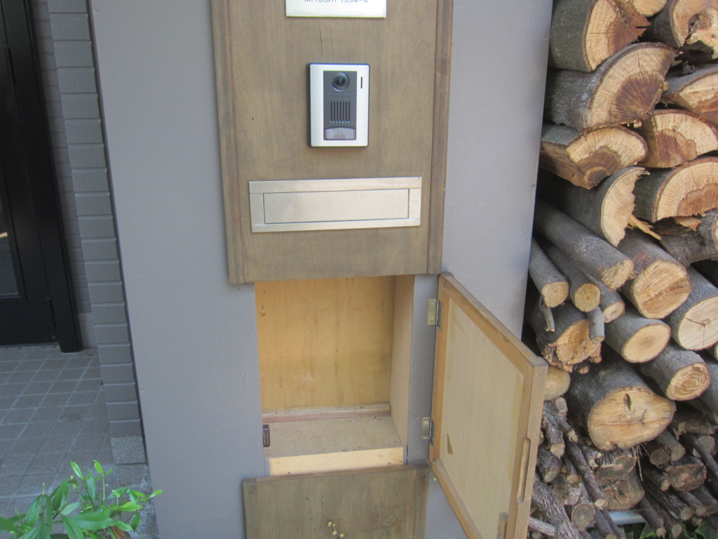 そのうちの左側はインターホン、郵便受けとなっていて、上部は収納スペースがあります。