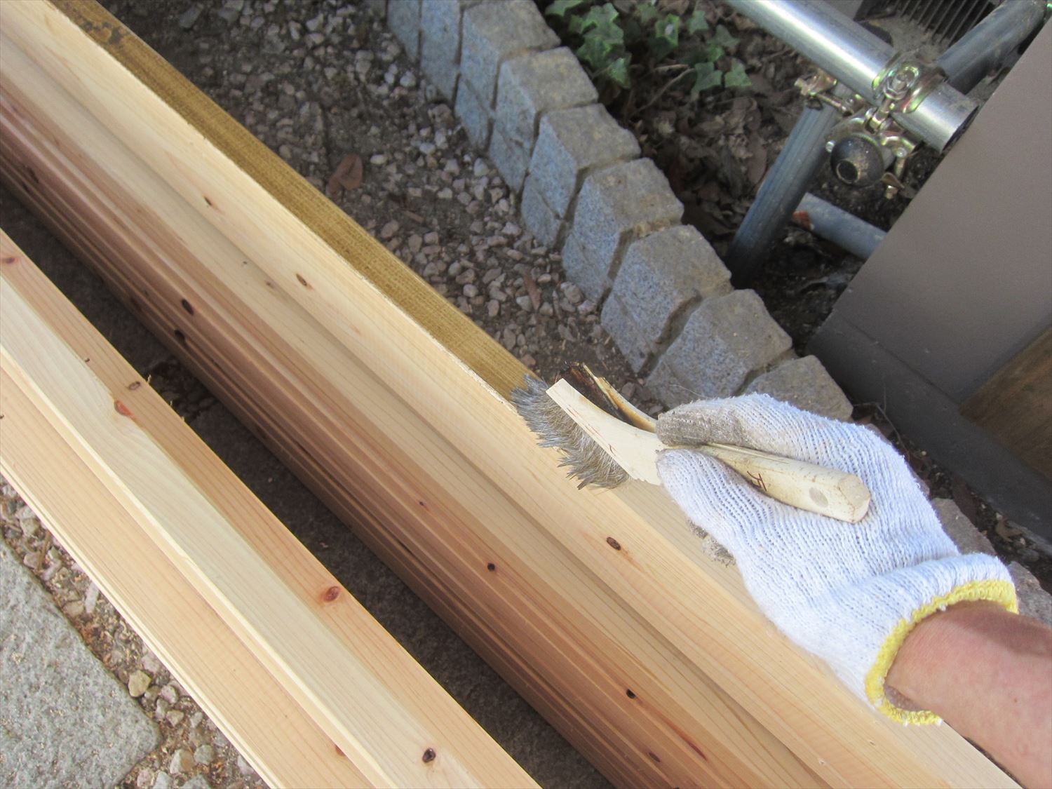 檜板と根太用の2×4防腐木材にキシラデコールを塗ります。