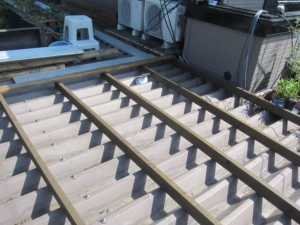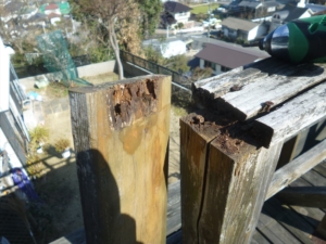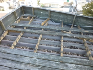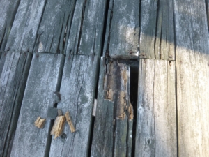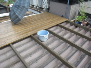 特に根太の上に板と板の継ぎ目が乗っかっている部分は、染み込んだ雨水が滞り、なかなか乾燥しないので特に老朽化が激しいです。