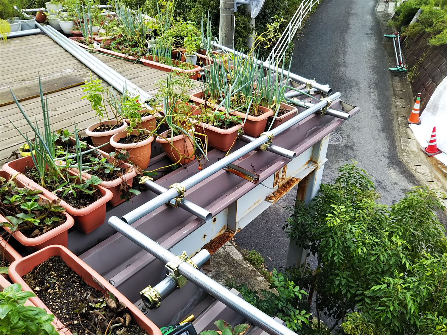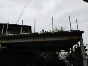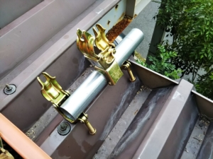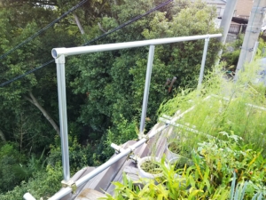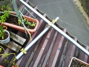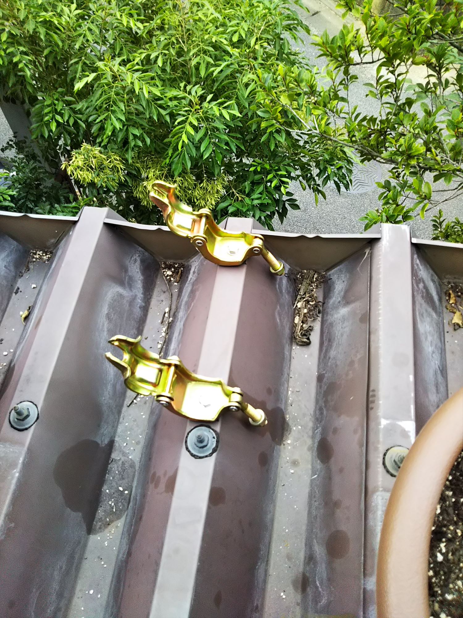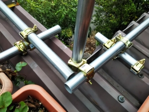 単管パイプを使って手摺を作れば、強いし長持ちするだろうとは思っていたのですが、鉄板の波板の屋根にどうやって固定するのか思案していたのです。