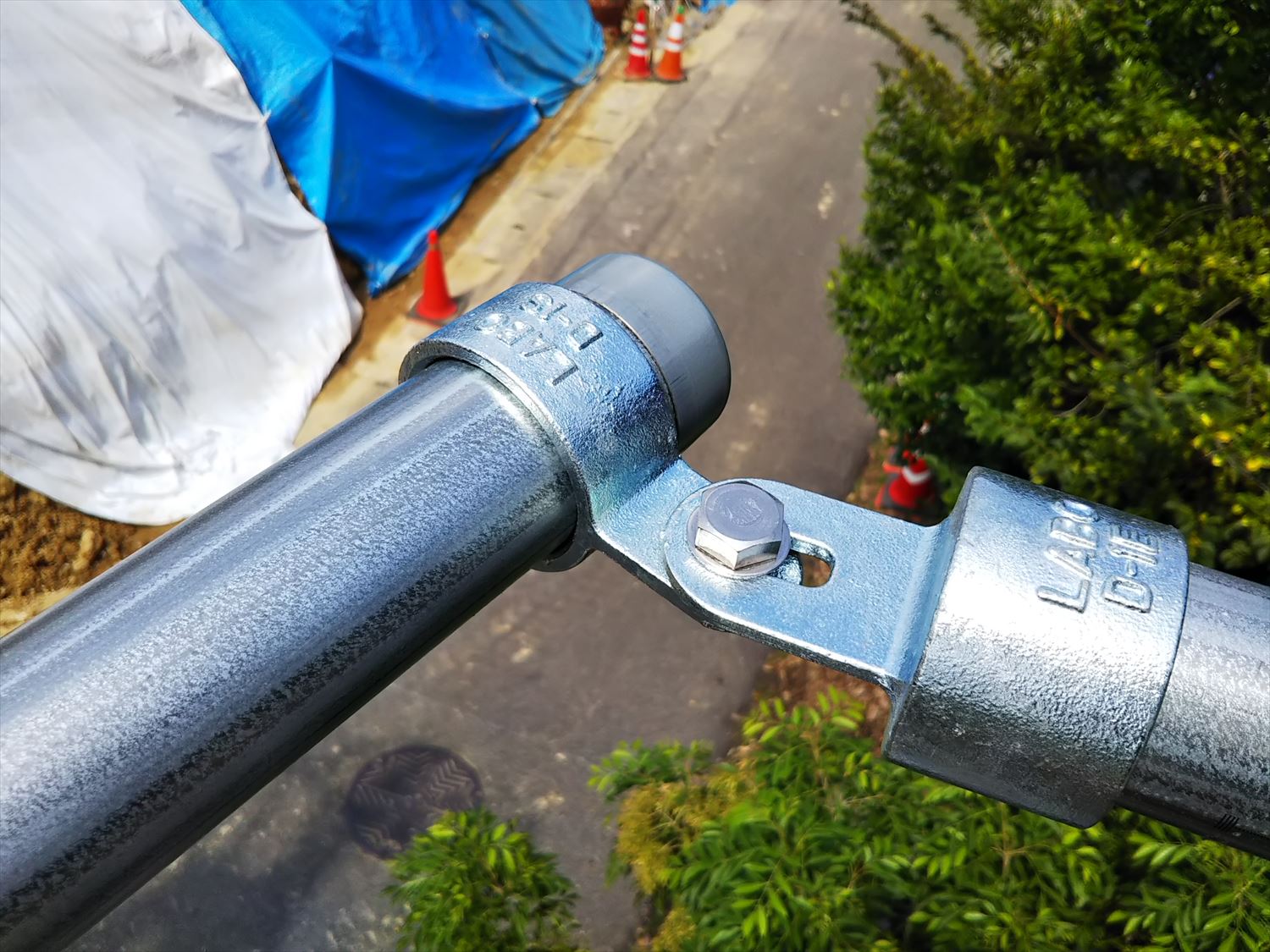 縦の単管パイプの先に、手摺となる横方向の単管パイプを単管パイプジョイントで繋ぎます。
