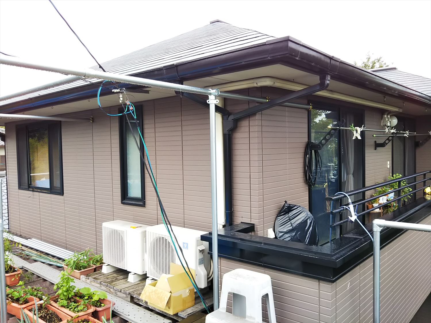 この建物と結合された2本の単管パイプを利用し、パーゴラを作っていきます。