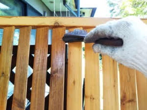 当初ホームセンターで買った安物の刷毛で塗ったのですが、キシラデコールの溶剤がきついのか毛がボロボロ抜けます。