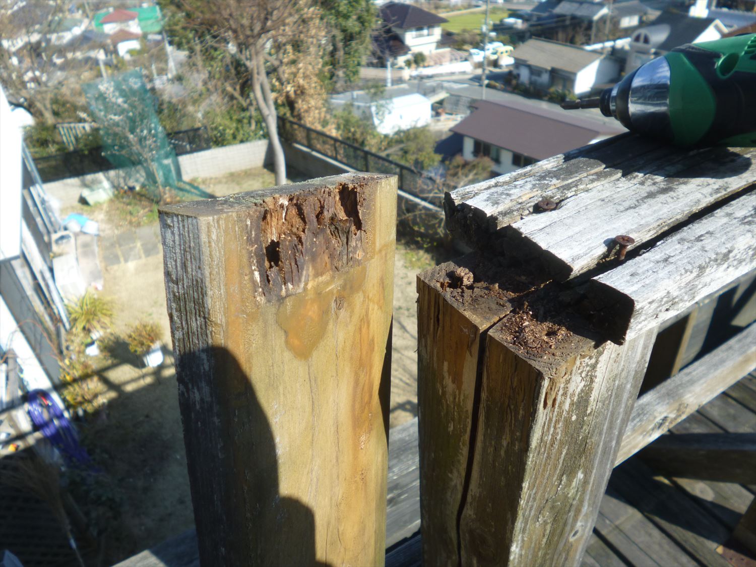 また手摺も腐り、薄い板はポテトチップスのように曲がってしまいました。
