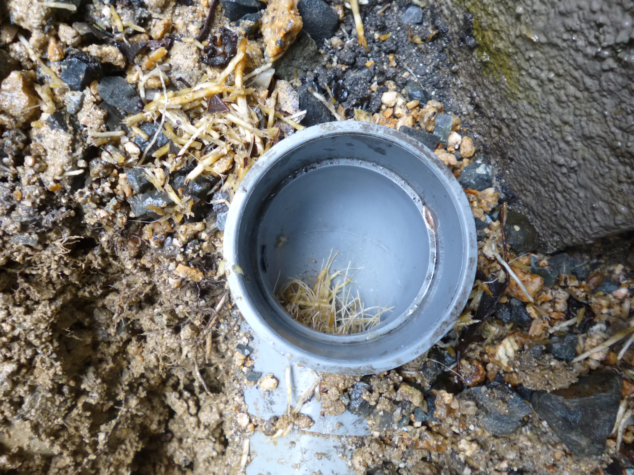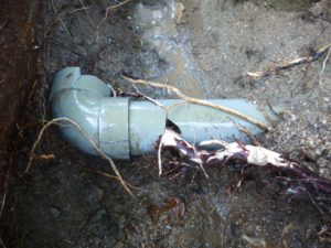 雨水の配水管に根が浸入し、排水できなくなりました。