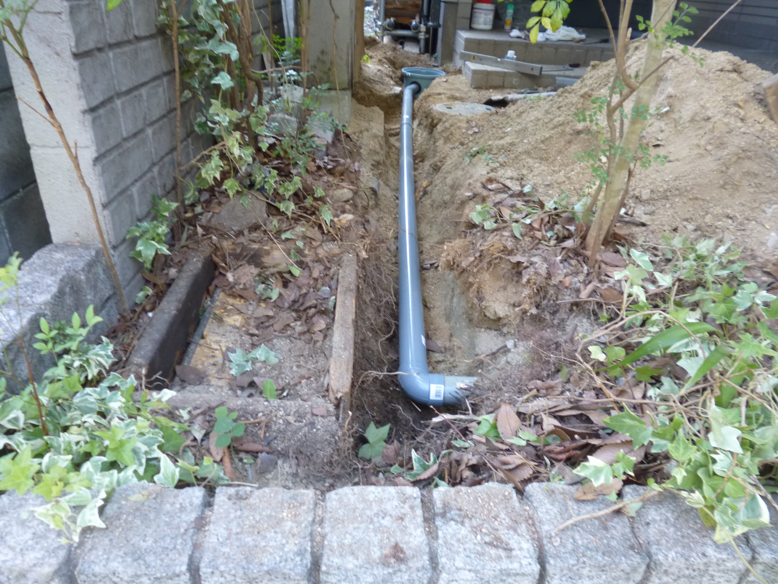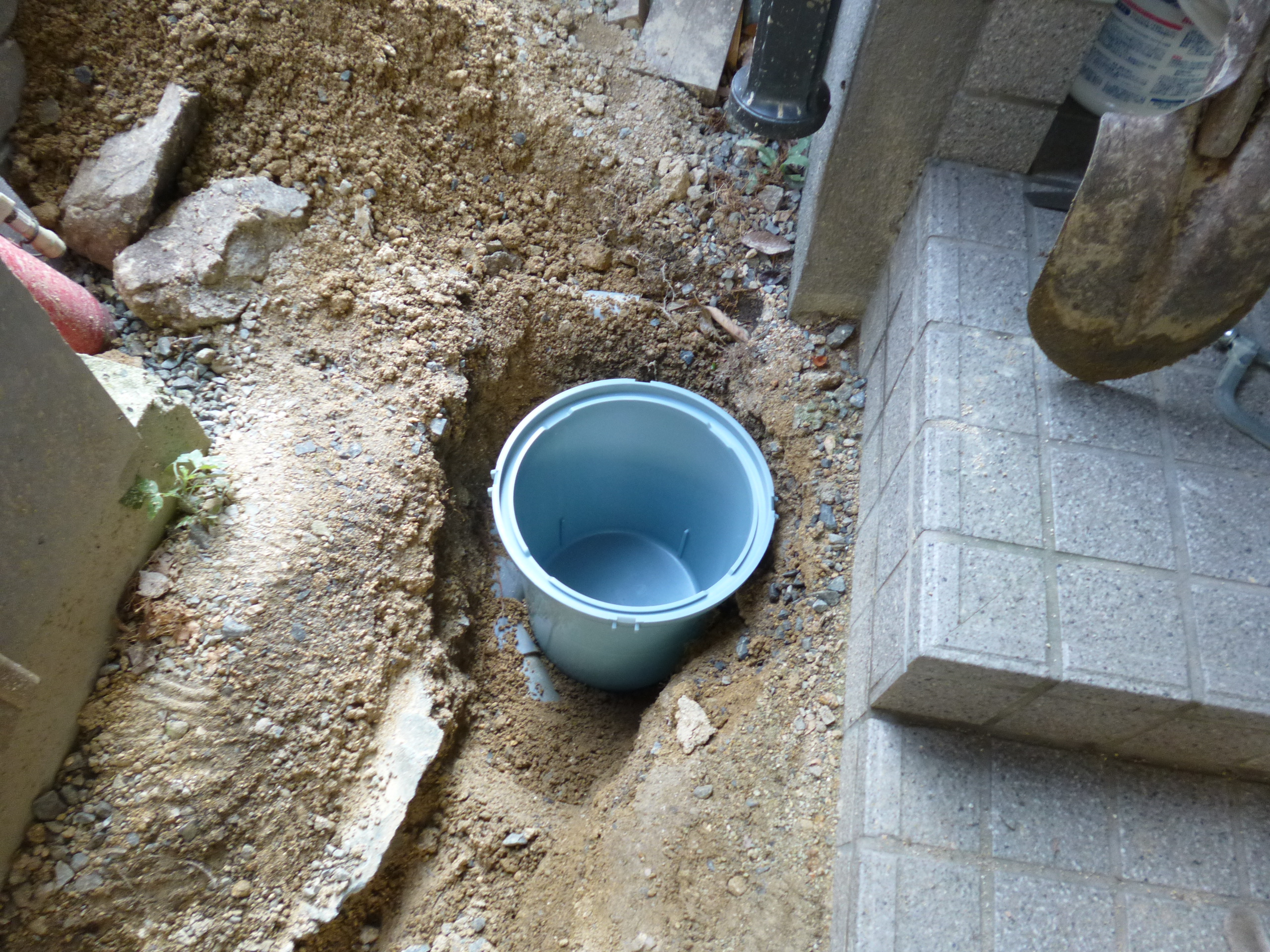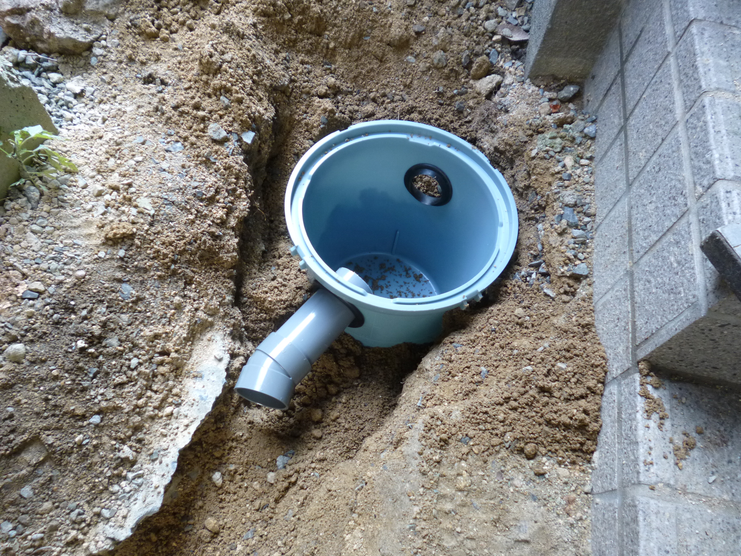 ホームセンターで一番小さい排水枡を買ってきて、縦樋の近くに穴を掘り、