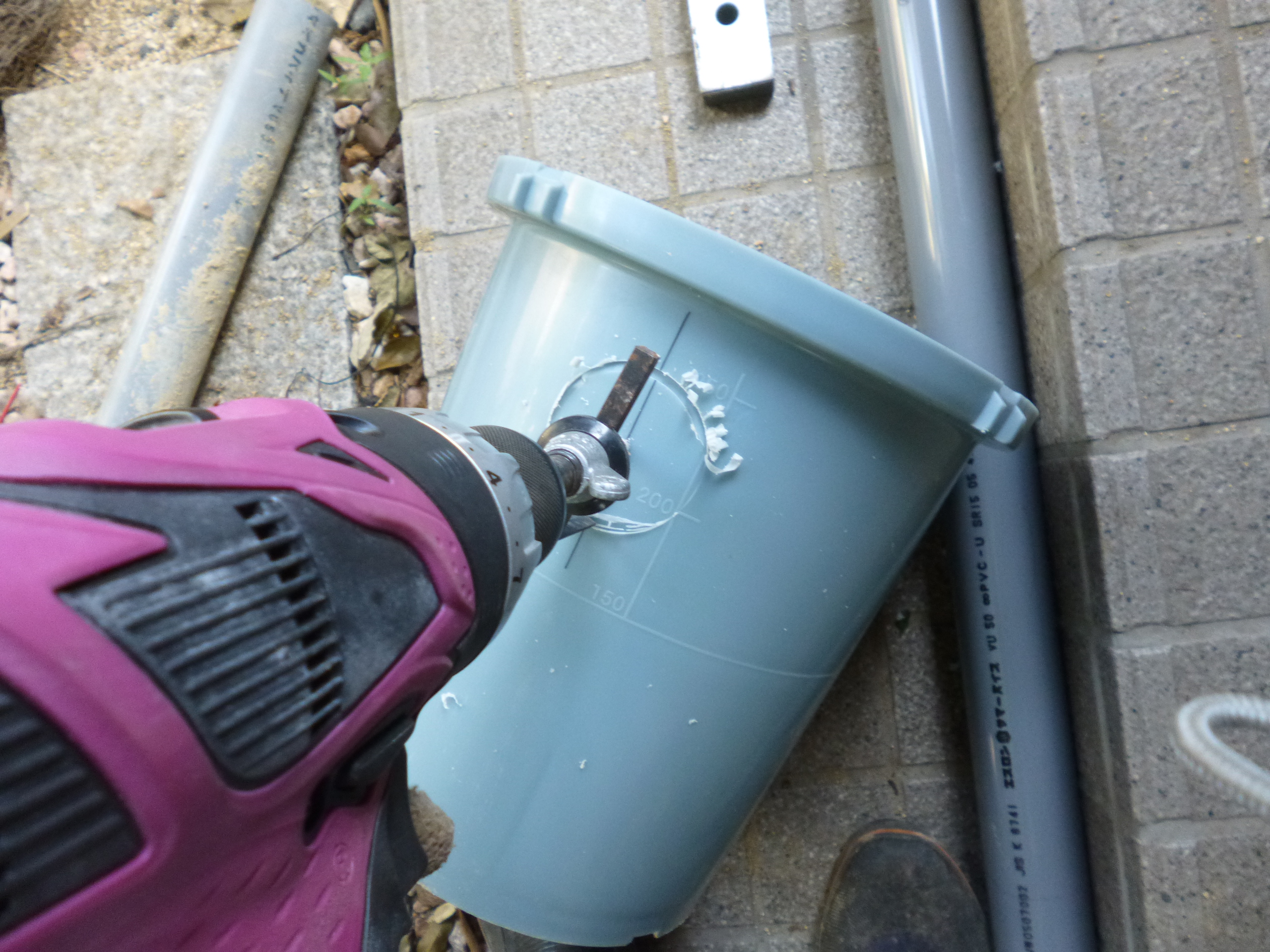 縦樋からの管と配水管側の管を通す穴を開けます。