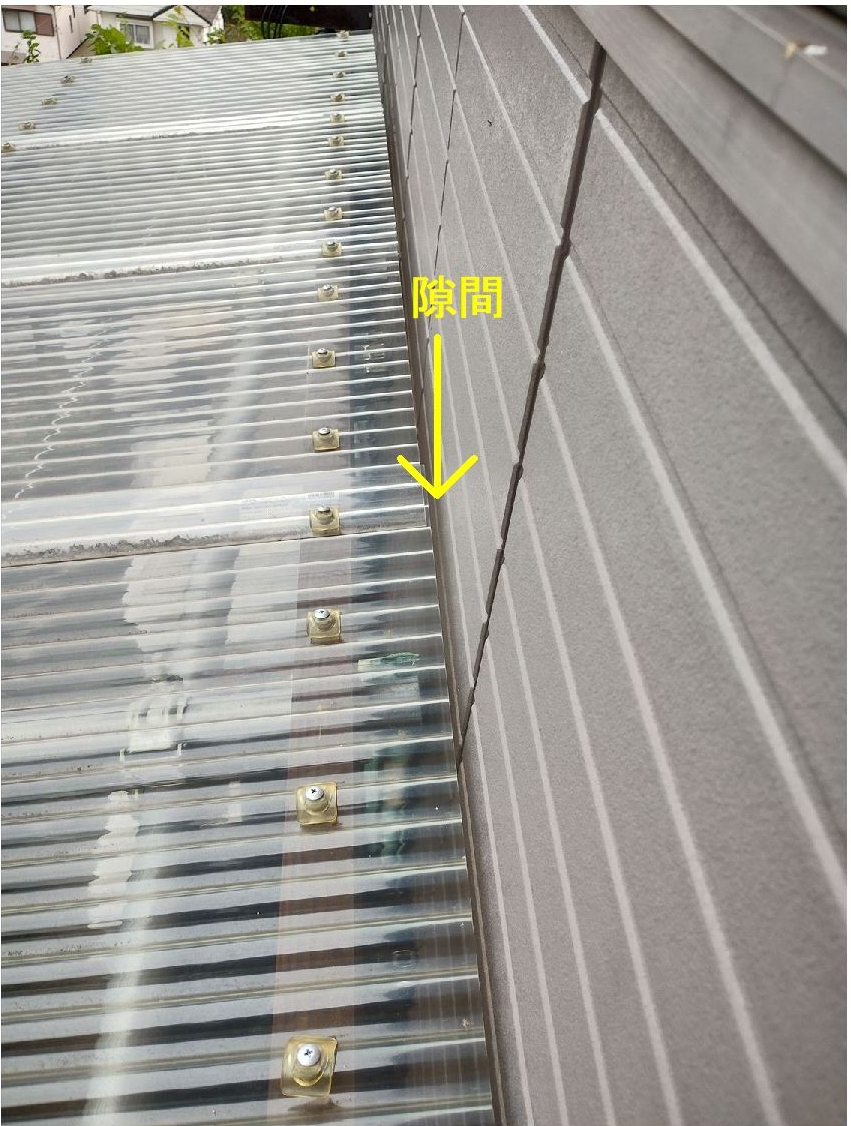 実は壁と波板の屋根との間にわずかな隙間があり、壁を伝って雨が侵入してくるのです。