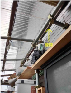 ポリカ波板の上で作業するので、合板を敷いて波板を支えてる垂木のある部分に乗って作業しました。