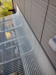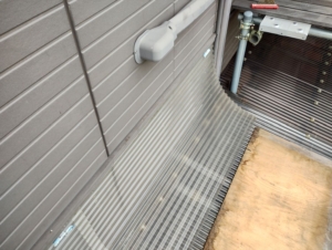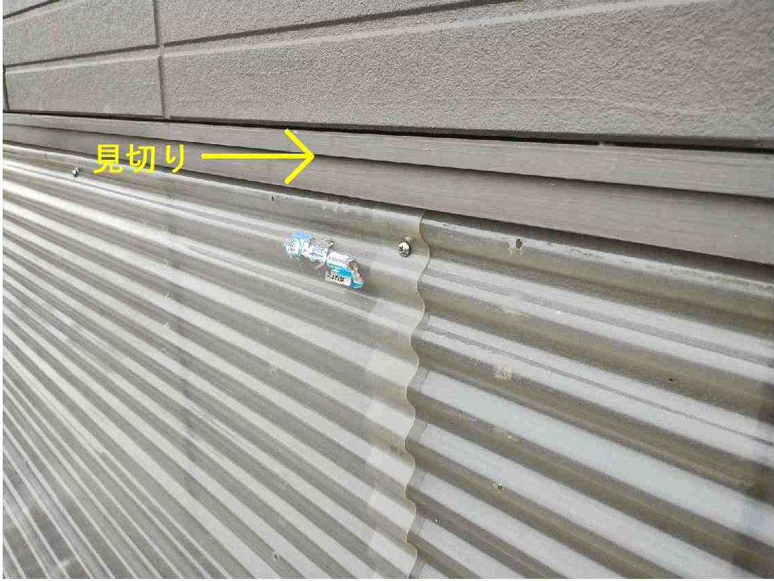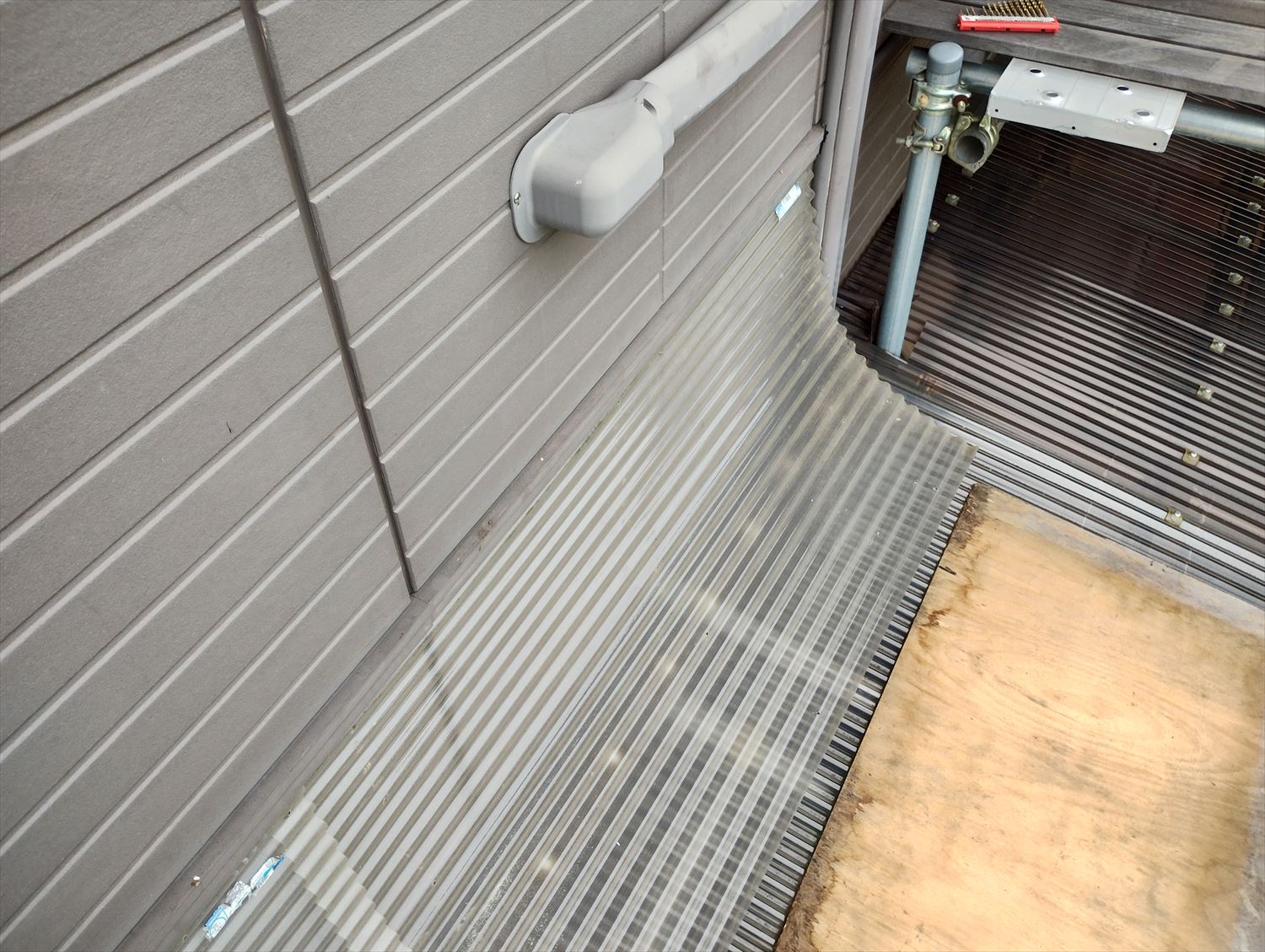見切りの下に隙間があったので、ここにポリカ波板を差し込み、外壁にステンレスのタッピングビスで固定します。