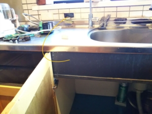 キッチンの壁はペラペラな合版なのでタンクが満水になると重くてネジでは耐えられないだろうから、下に木材を敷いて支えるようにした。