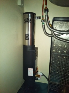 青矢印の所にエコキュートからの水が入ってきて、ほっとエキスプレス上部タンクの80℃の湯とミックスされ赤矢印の所から38℃の湯として排出される。