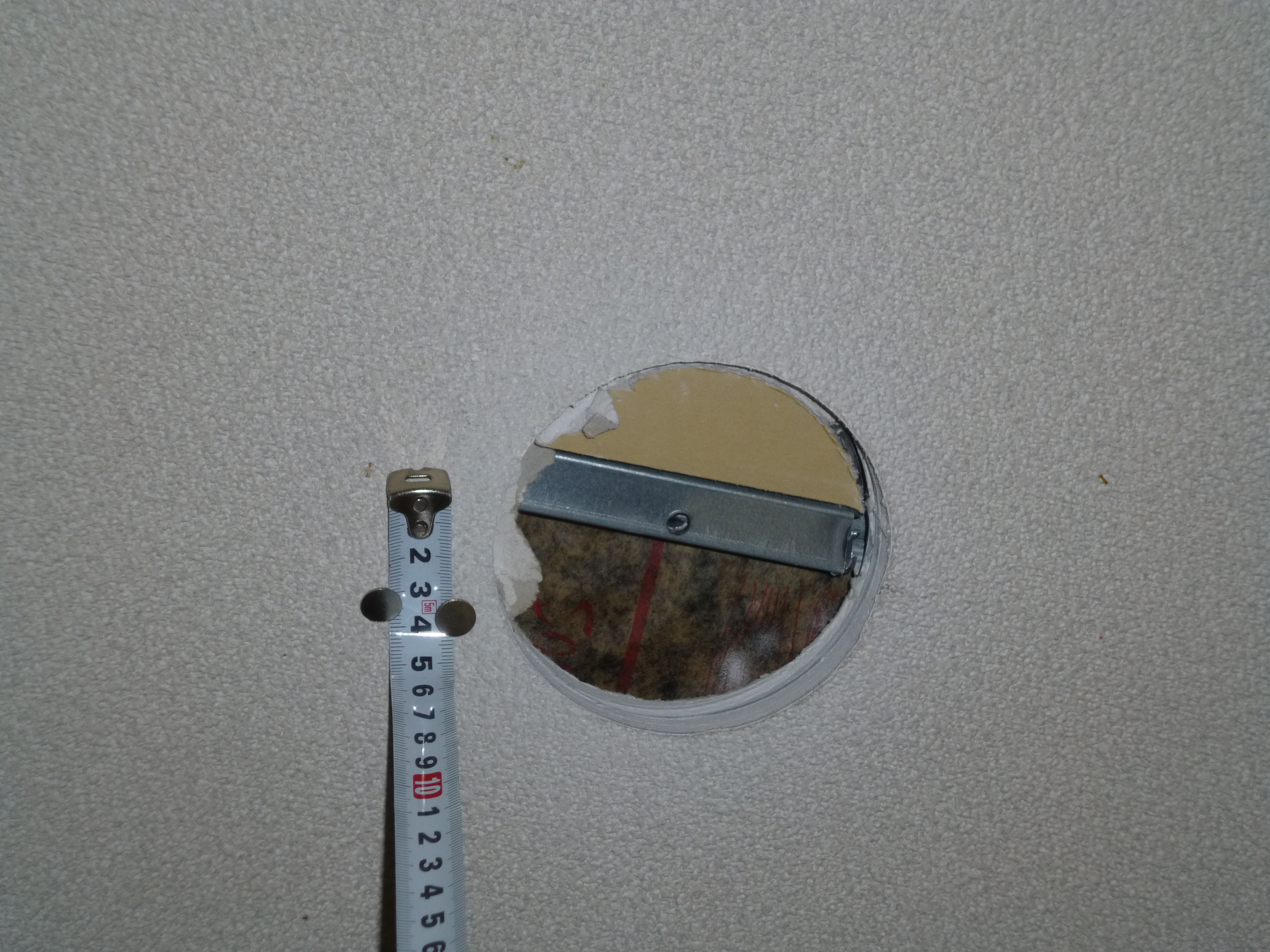 間違って軽天に当ててしまった穴は、同じサイズの円盤を木で作り、似たような色合いの壁紙を貼っておきました。