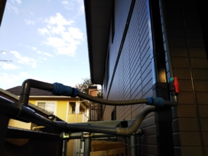 大雨でタンクの水が溢れたときには、このホースから側溝へ排水されます。