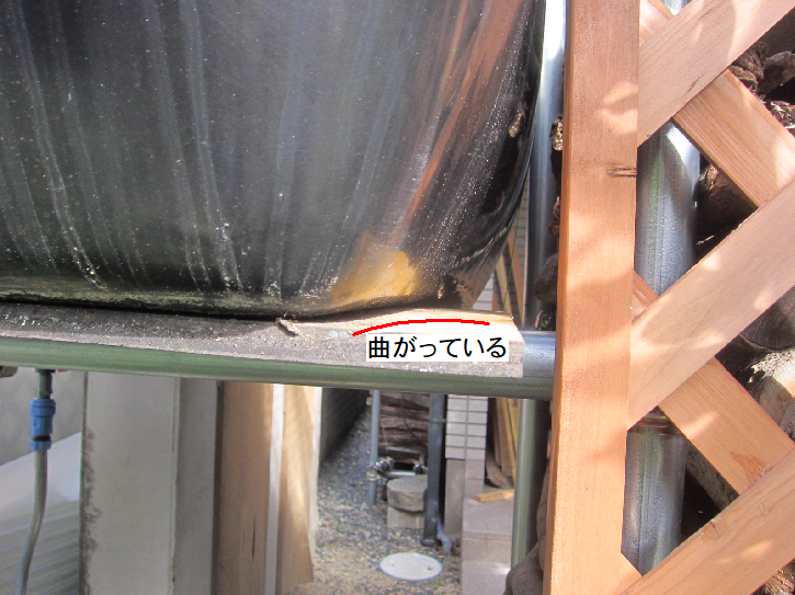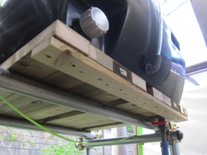 したがって第2のタンクは最初2本の単管パイプの上にコンパネを敷いてその上に置いていたのですが、徐々に両端が垂れ下がってきたので、単管パイプの上に角材を敷きその上にタンクを置き直しました。