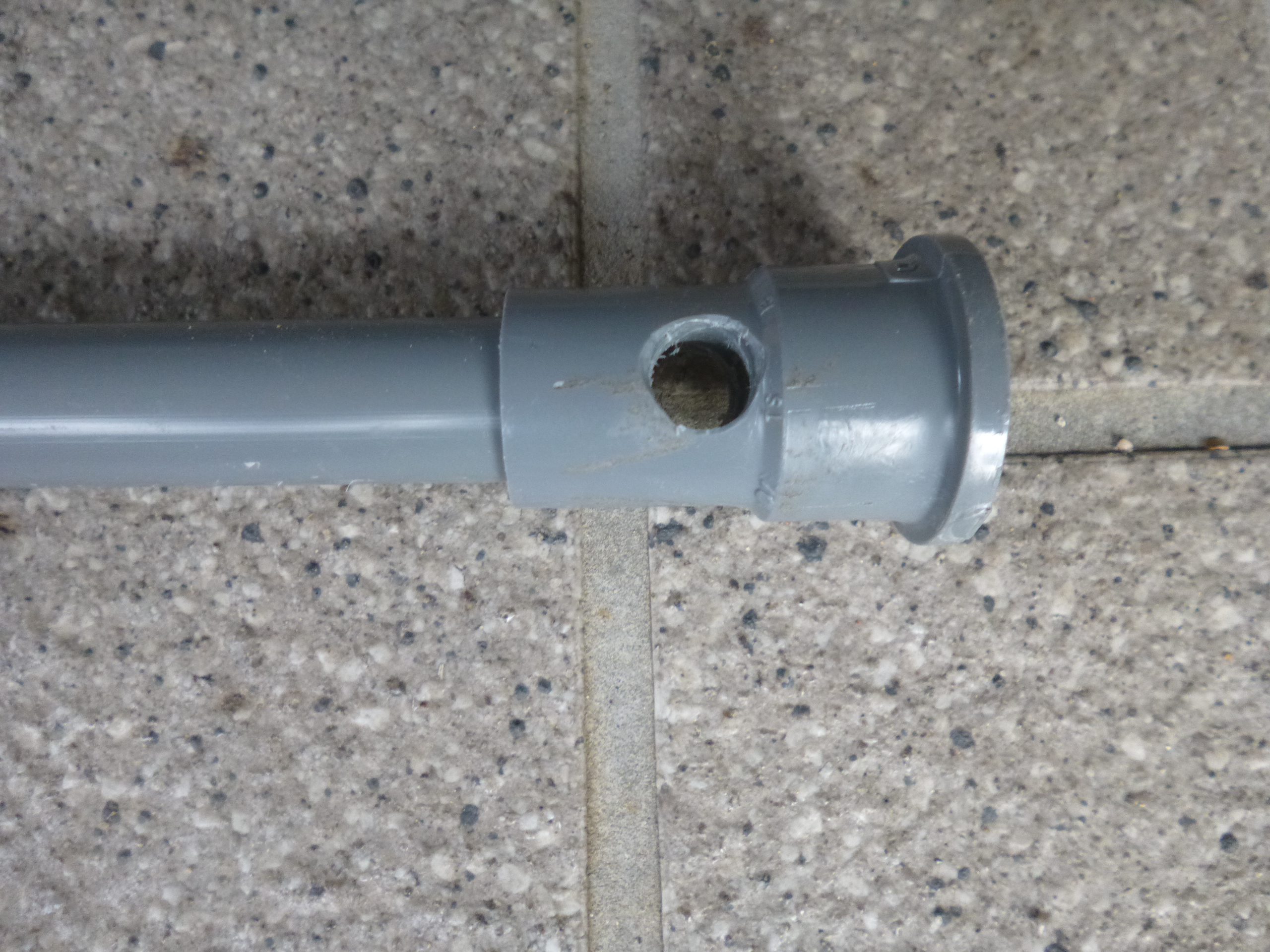 この部品にはタンクの水が流れ出るように縦の水道管の下の方に横穴を開けています。