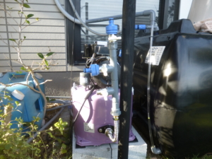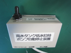 雨水タンクの水が減ってくると、ポンプに水が供給されなくなり、ポンプが空運転するので、そうならないよう低水位になると自動的に水道水を雨水タンクに供給する装置を作りました。