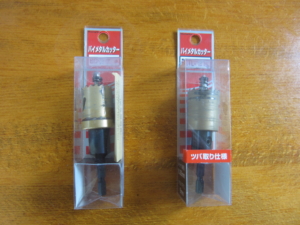 ツバなしのホールソーが。写真左がツバ有り、右がツバなしです。