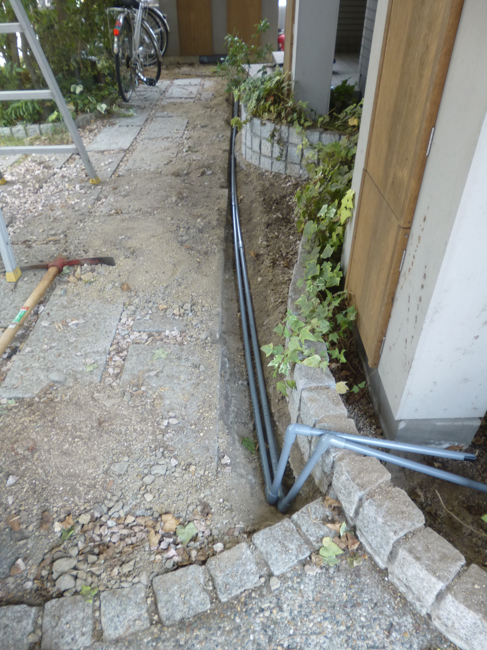 掘ることができない部分は、凍結防止材を巻いた後地上に配管しました。