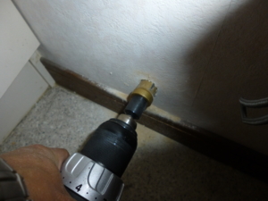外壁まで貫通したら、そのまま外壁の外へホールソーを取り外します。