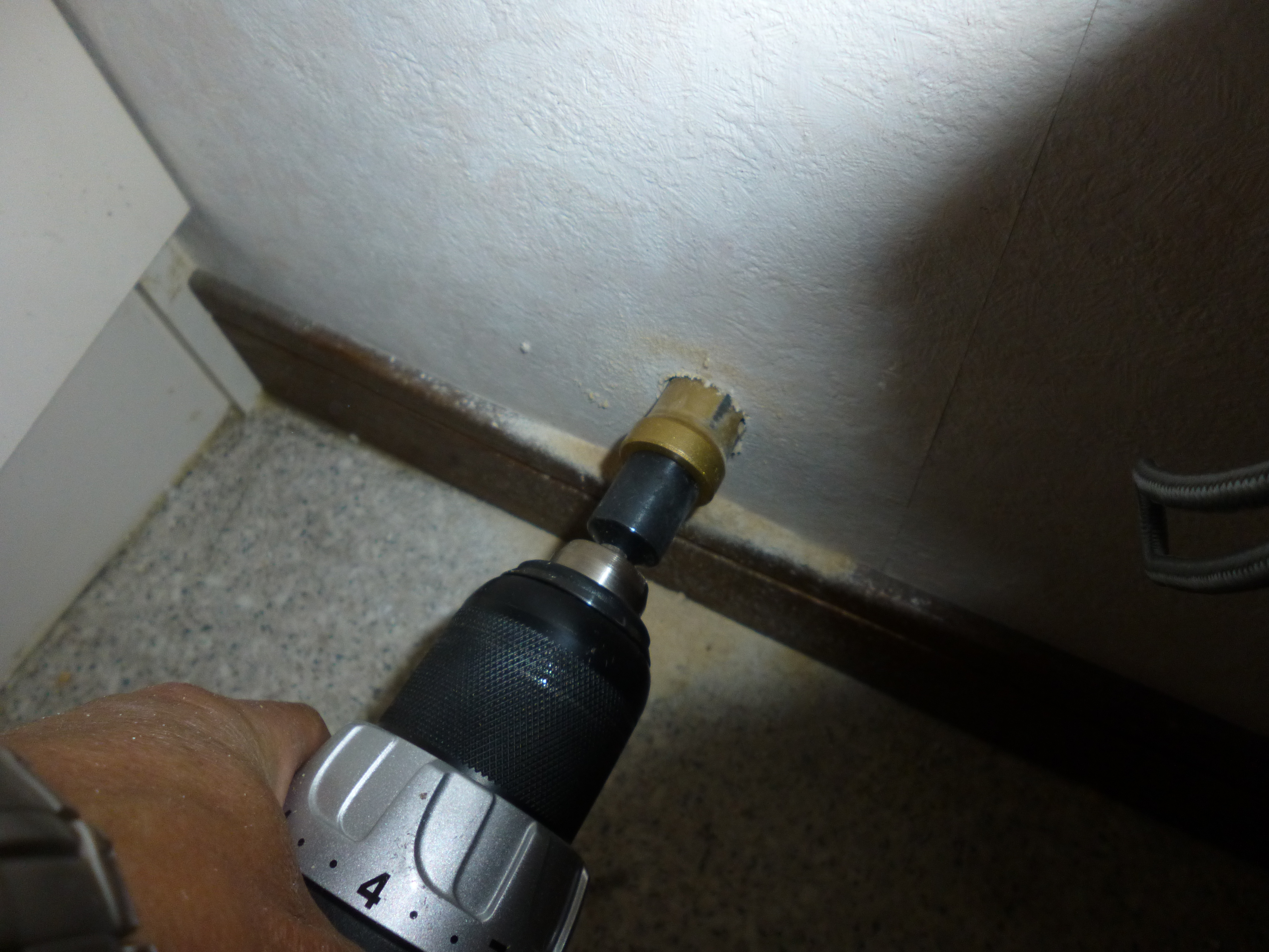 フレキシブルパイプを通すには、直径26mm以上の穴を開ける必要があるので、直径27mmのホールソーを購入し、トイレの内側から穴を開けました。そしてそのまま外壁へ突き進もうとしたら、ウォォー先へ進まない