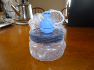 キムチの空き容器に穴を開け、その外側をストッキングタイプのゴミ取りネットで覆いました。容器の蓋の部分からホースで取水します。容器は浮かないよう石を入れておきます。