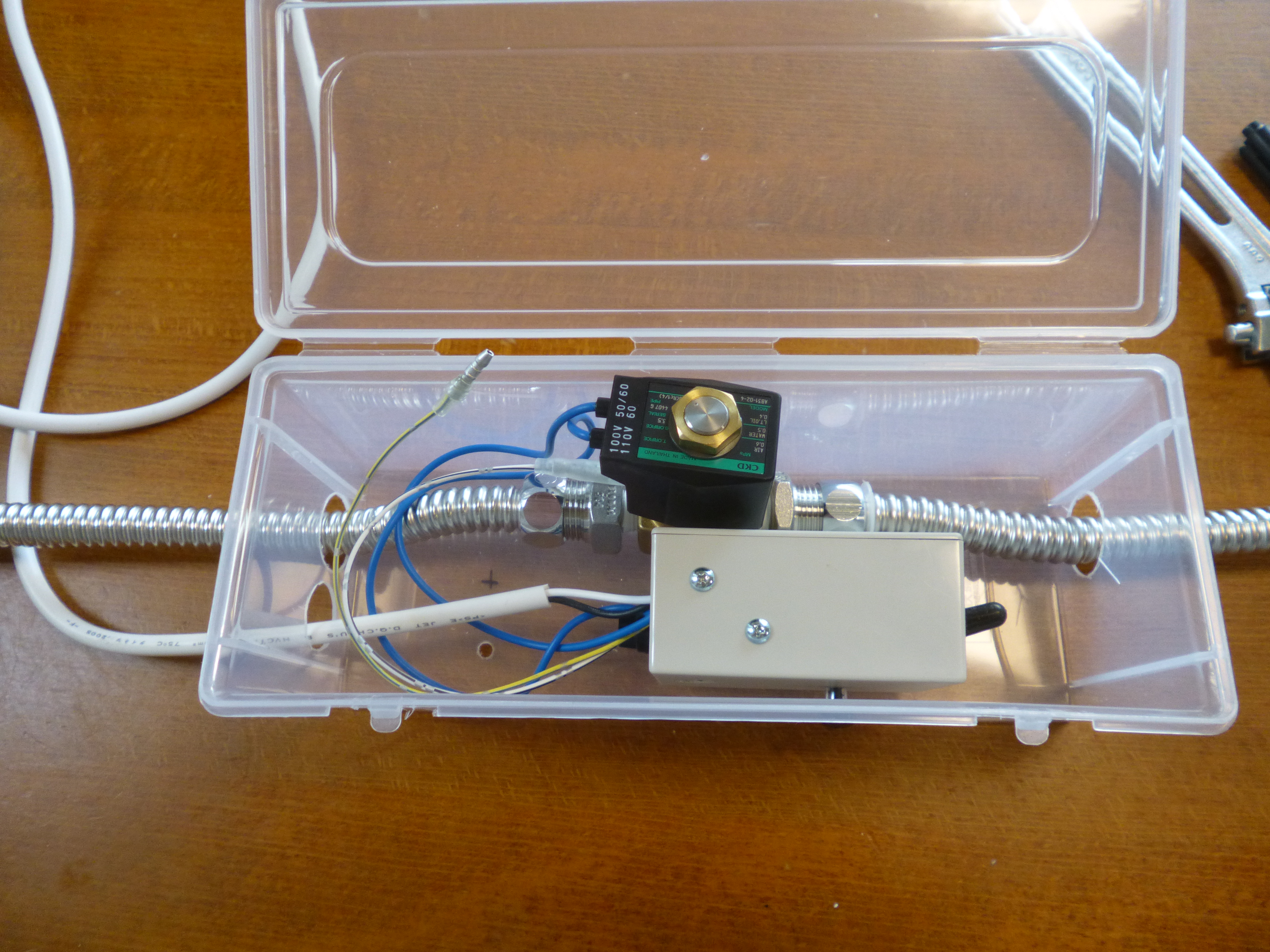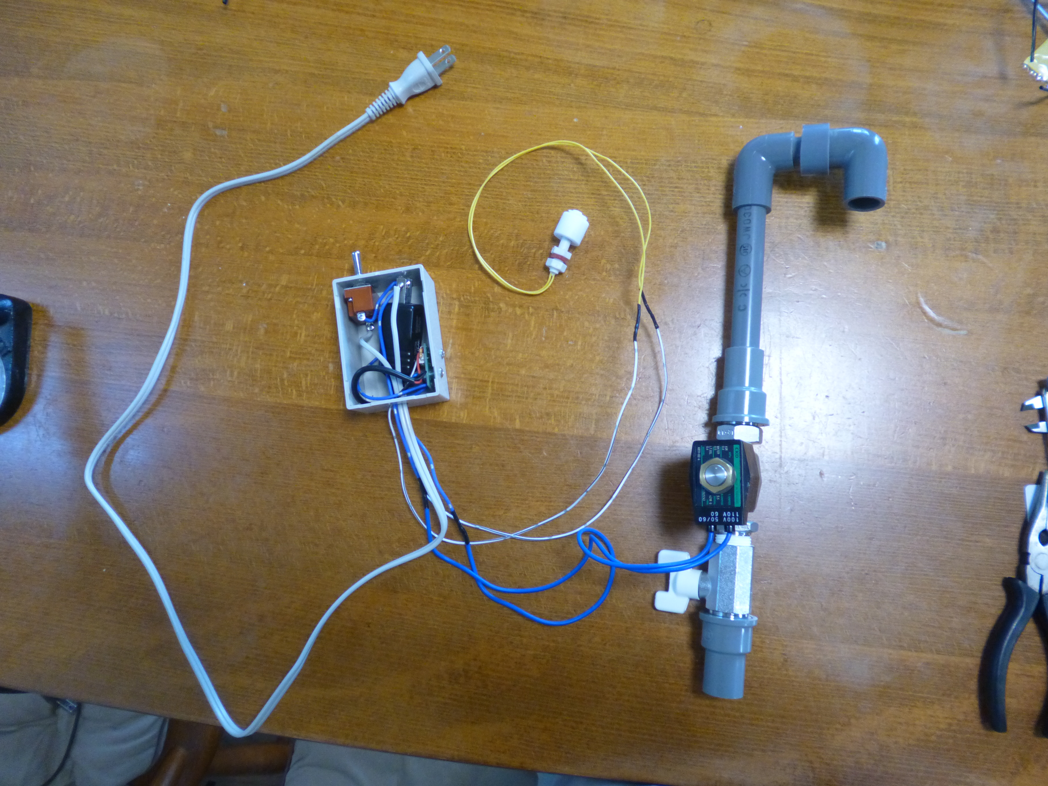 これもフロートスイッチ、SSR、電磁バルブで構成しました。給水源は水道です。
