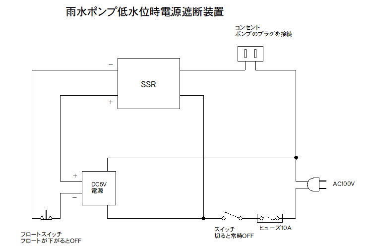 ロータンク用の電磁バルブをコントロールしていたSSRを利用し、水位が高いときはポンプの電源がON、下がったらOFFになるよう設計しました。