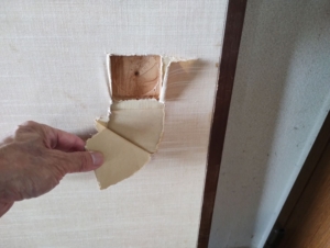 しかし以前破れていた部分が下に潜んでいるのですが、襖紙を貼ったあともその痕跡が少し表面に現れます。