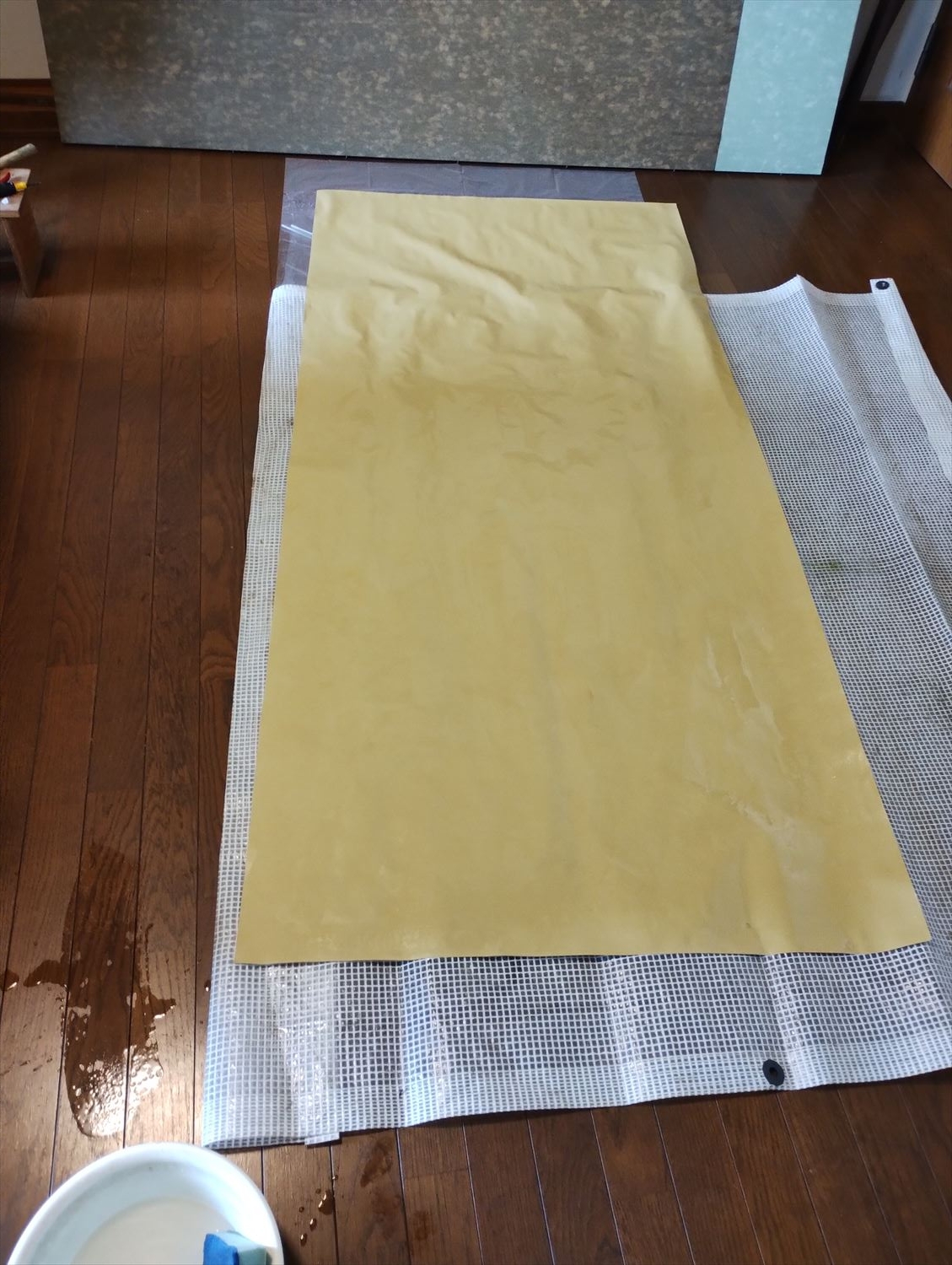ただしアサヒペンの商品は長さが180cmと長さが足りないので、あちこち探したあげくホームセンター・コーナンで菊池襖紙というメーカーの長さ203cmのアイロンばりのものを購入しました。
